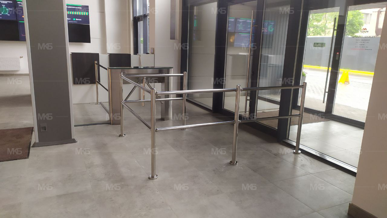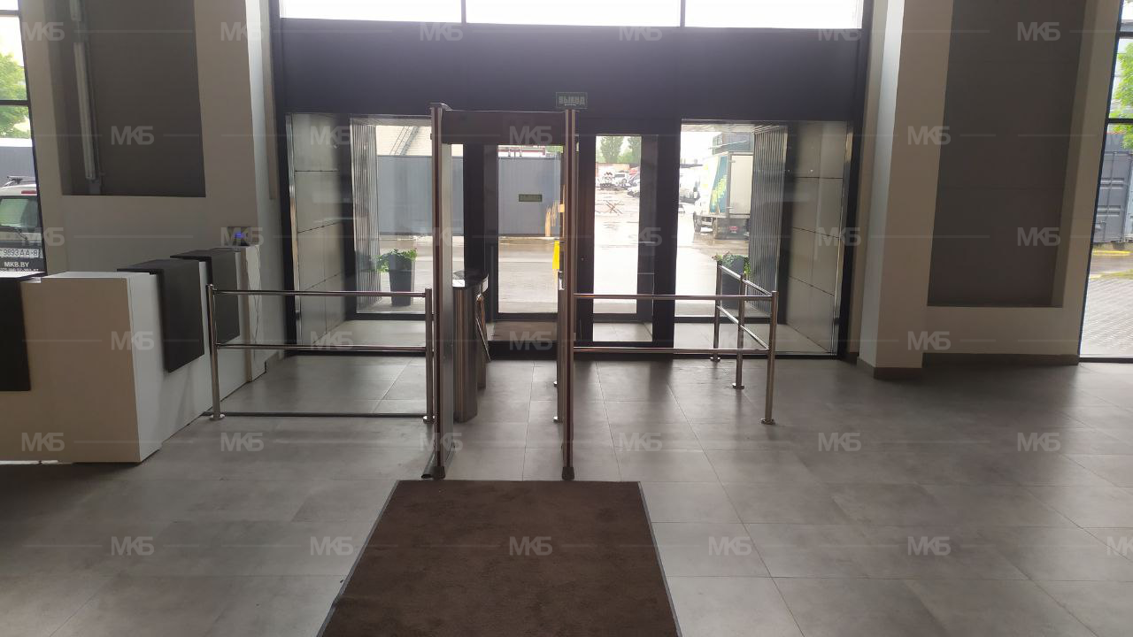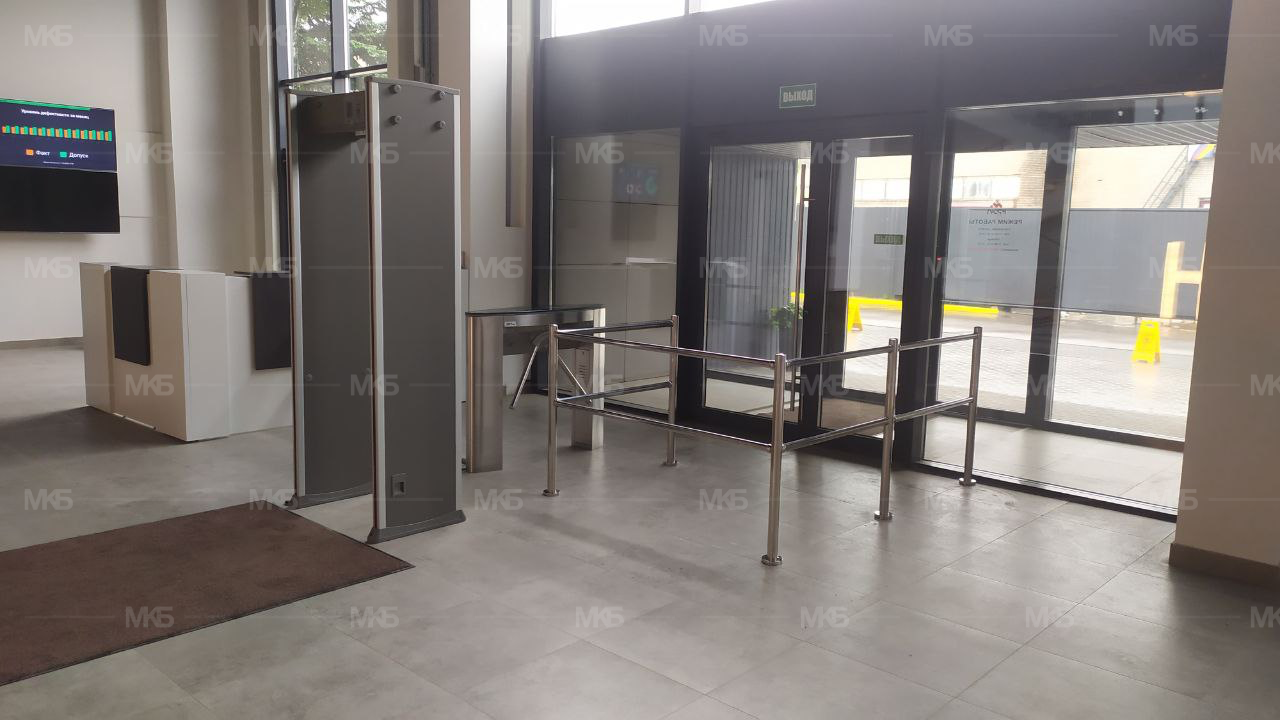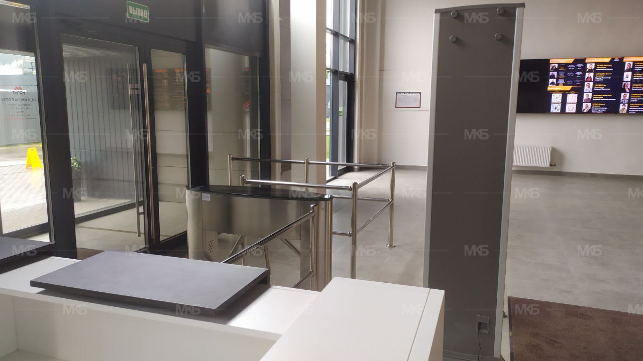 Установка системы контроля и управление доступом на проходной делового центра и завода. Модульные ограждения из нержавеющей стали, турникет автоматический с электроприводом (плавный ход, поворот планок, автоматическая Антипаника (откидывание планок при сигнале от пульта, контроллера, ОПС) и автоматический возврат преграждающей планки, арочный металлодетектор на 18 зон детектирования. Установка ПО PERCO.