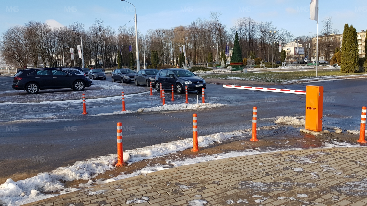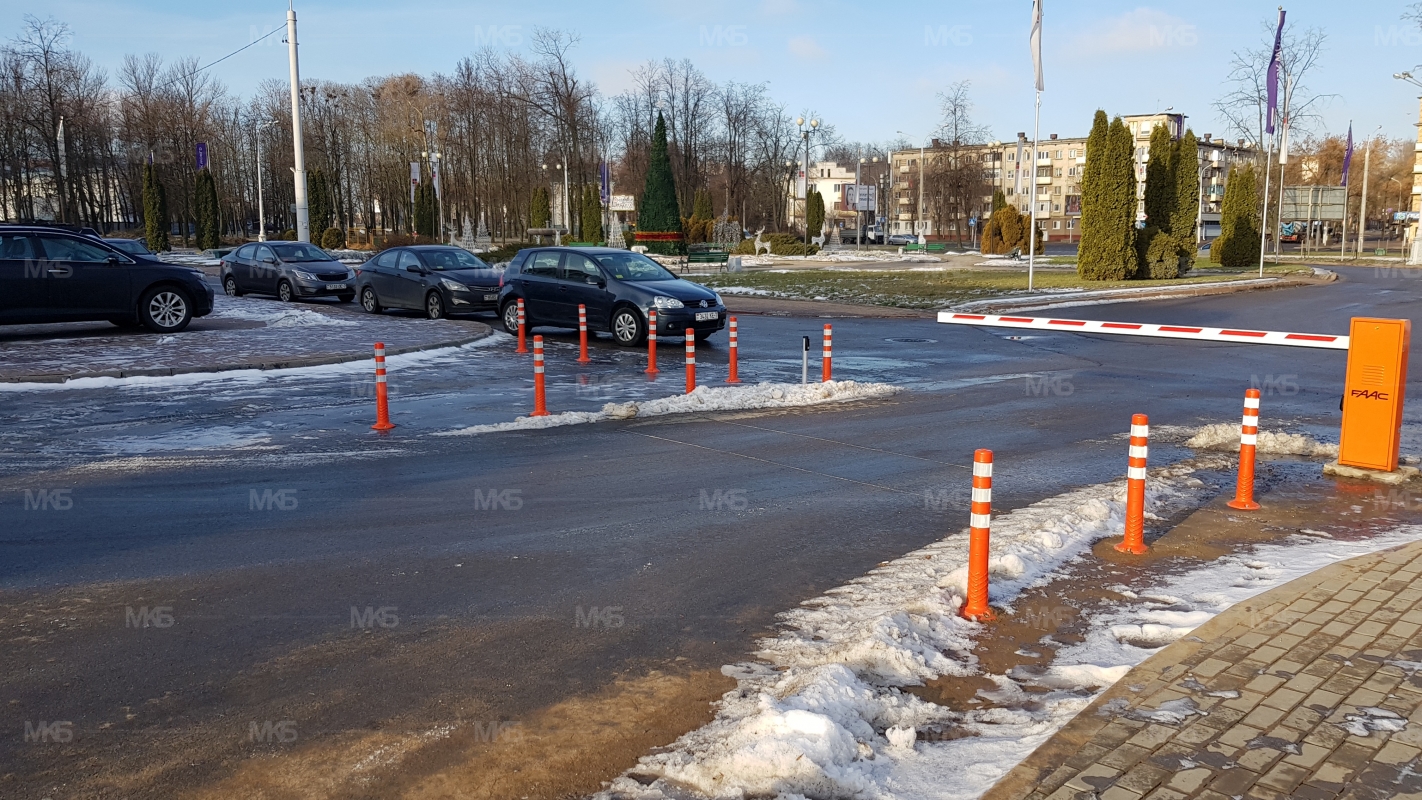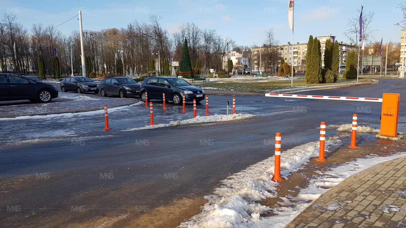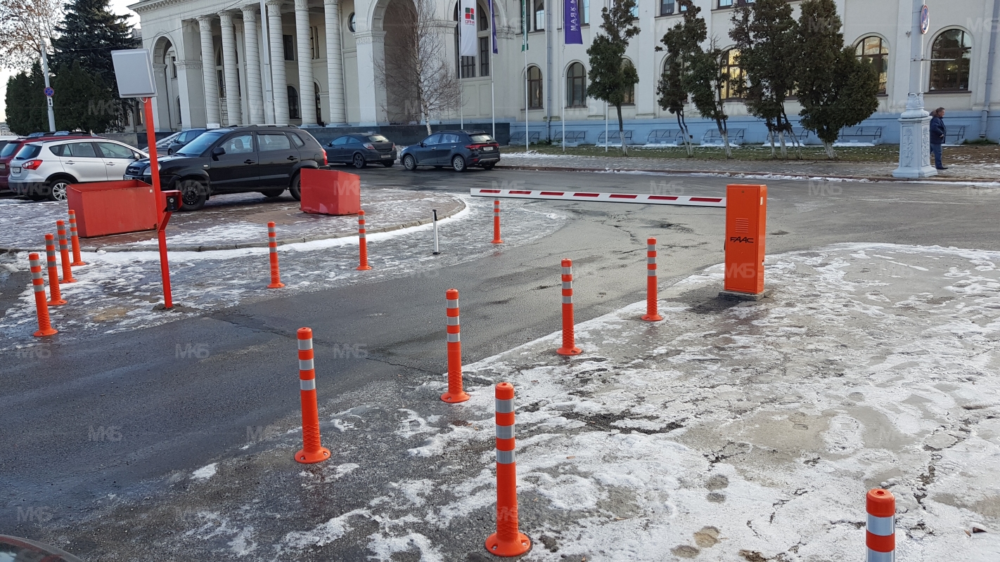 Установка системы RFID парковка. Скоростная гидравлическая автоматика FAAC. Въезд по RFID меткам, выезд по индукционной петле автоматически. Использование гибких парковочных столбиков для организации движения и маневрирования.