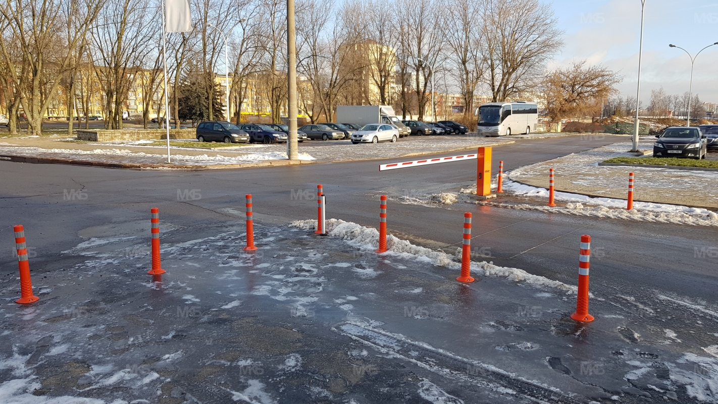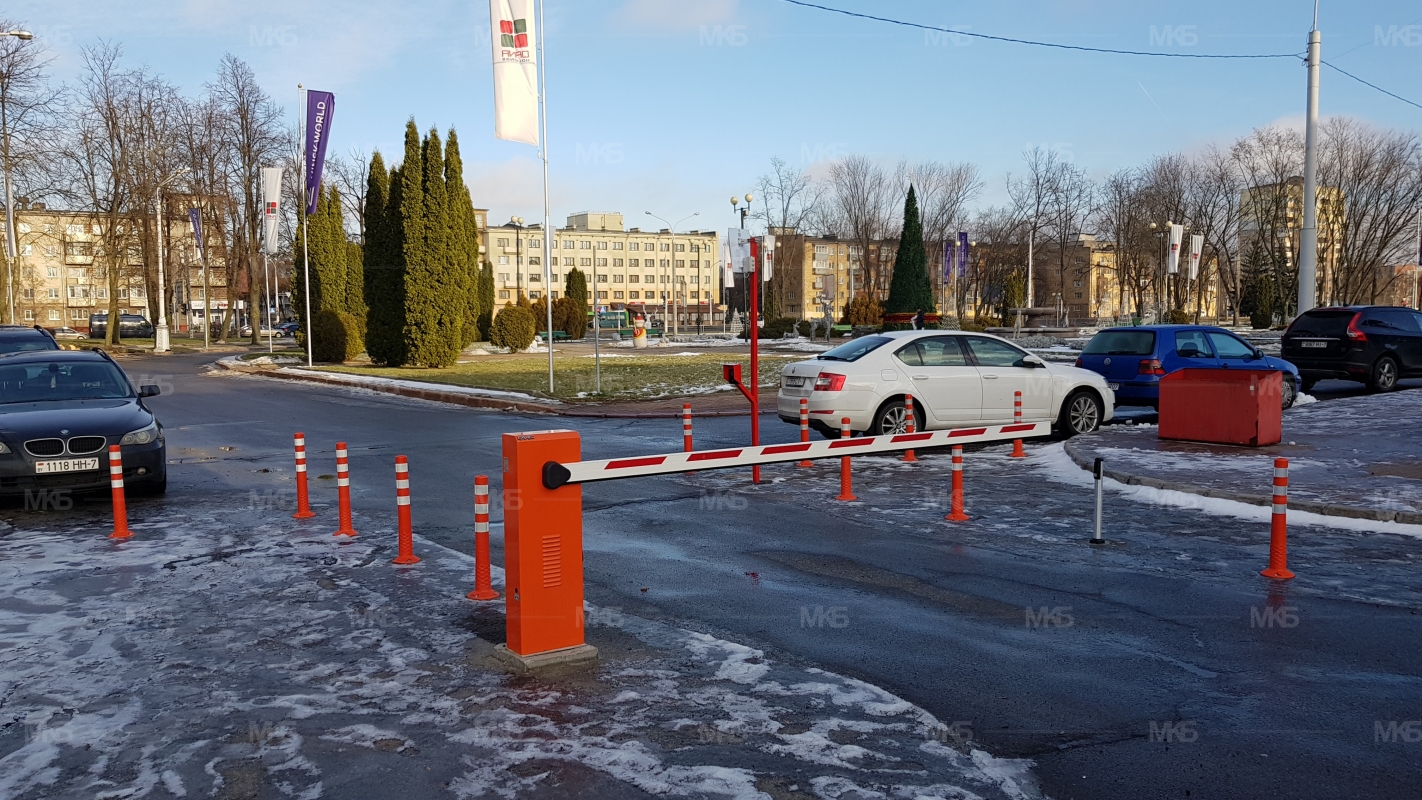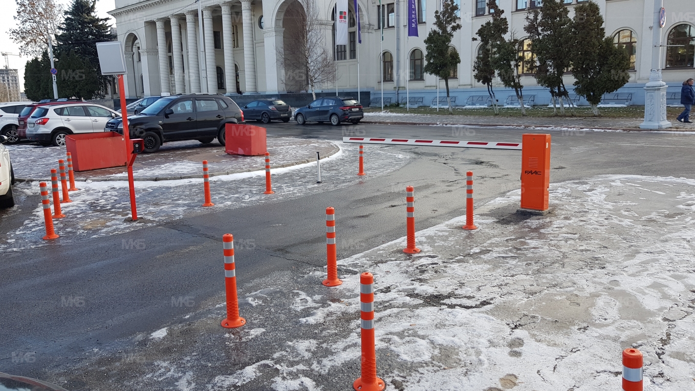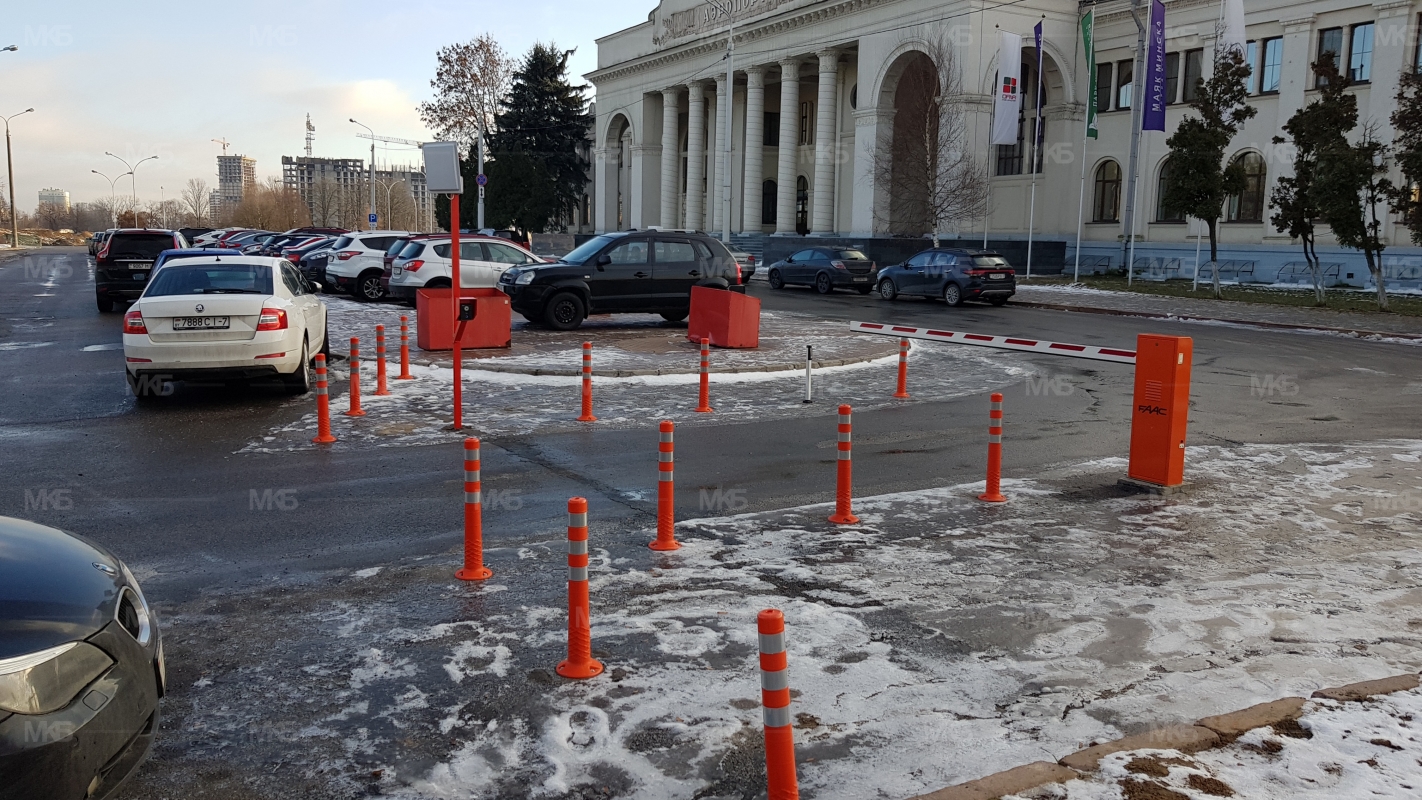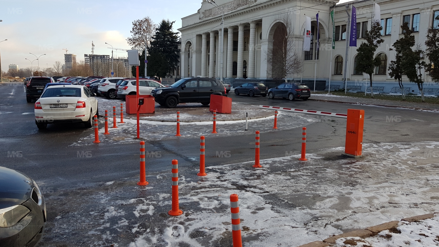 Установка системы RFID парковка. Скоростная гидравлическая автоматика FAAC. Въезд по RFID меткам, выезд по индукционной петле автоматически. Использование гибких парковочных столбиков для организации движения и маневрирования.