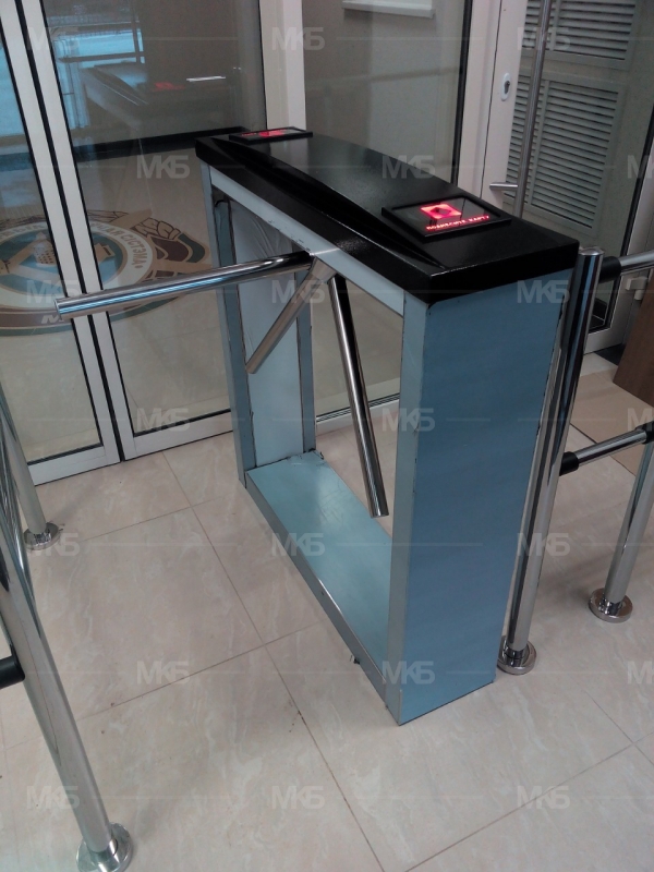 Установка тумбового турникета с системой контроля доступа и учета рабочего времени. Система модульных хромированных ограждений с Антипаникой.