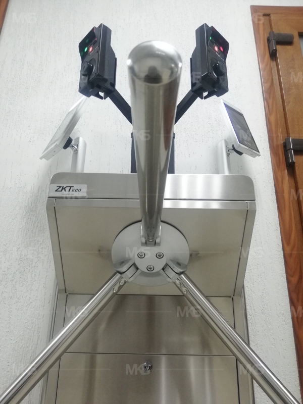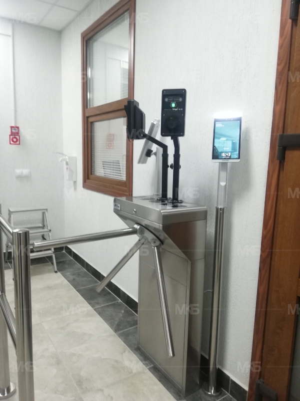 Установка системы контроля и управление доступом на проходной организации. Турникет-трипод с терминалом распознавания лица с измерением иемпературы и алкотестером на вход, система модульных ограждений, терминал распознавания лица и алкотестером на выход.