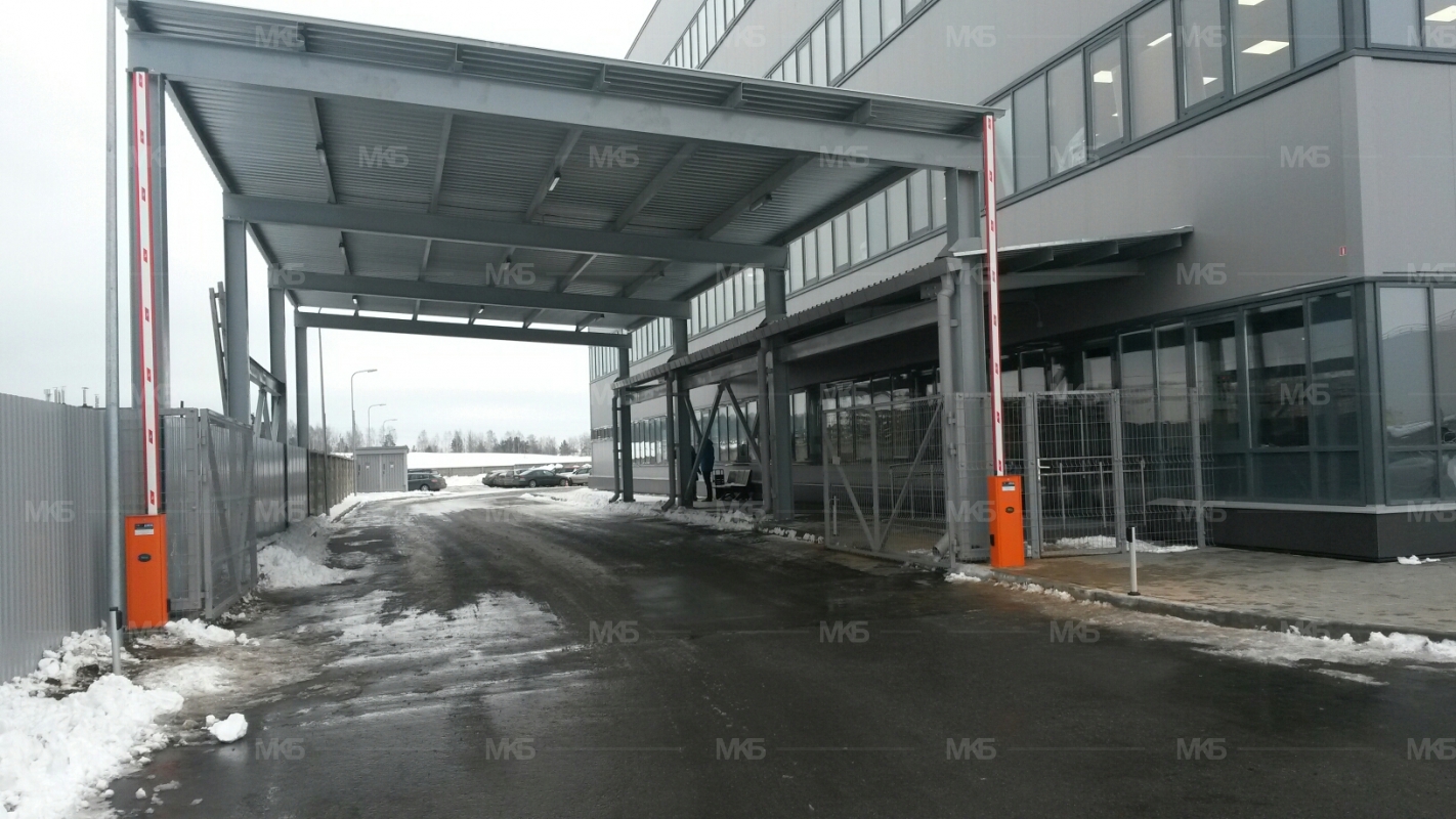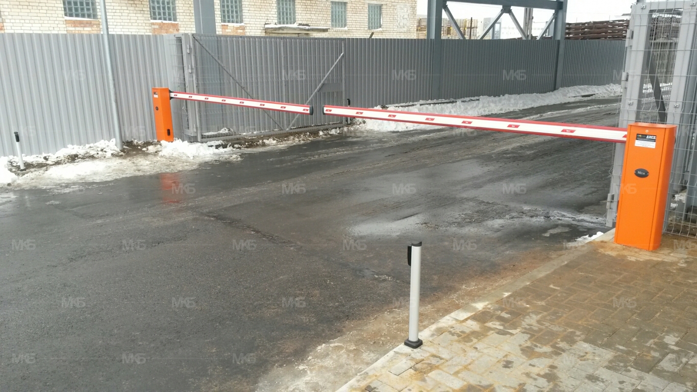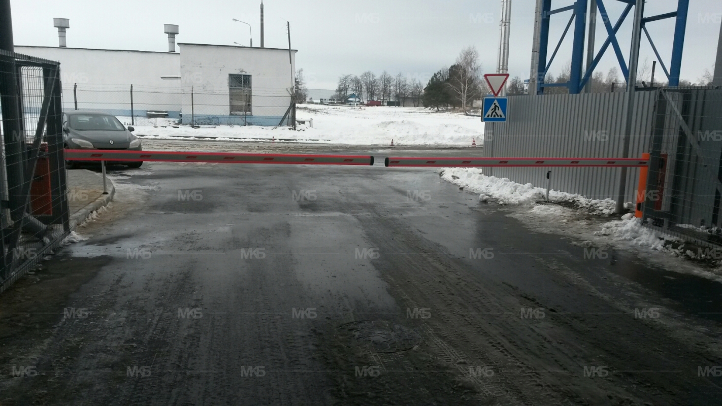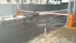 Организация пропускного режима. Установка 2-х шлагбаумов NICE WIL4, управление стационарное и радио. Датчики безопасности (фотоэлементы) вынесены на расстояние 2-х метров на въезд и выезд, и также располагаются под стрелой шлагбаума.