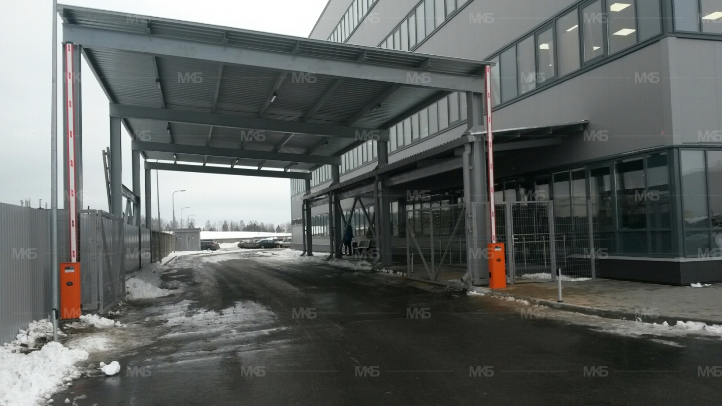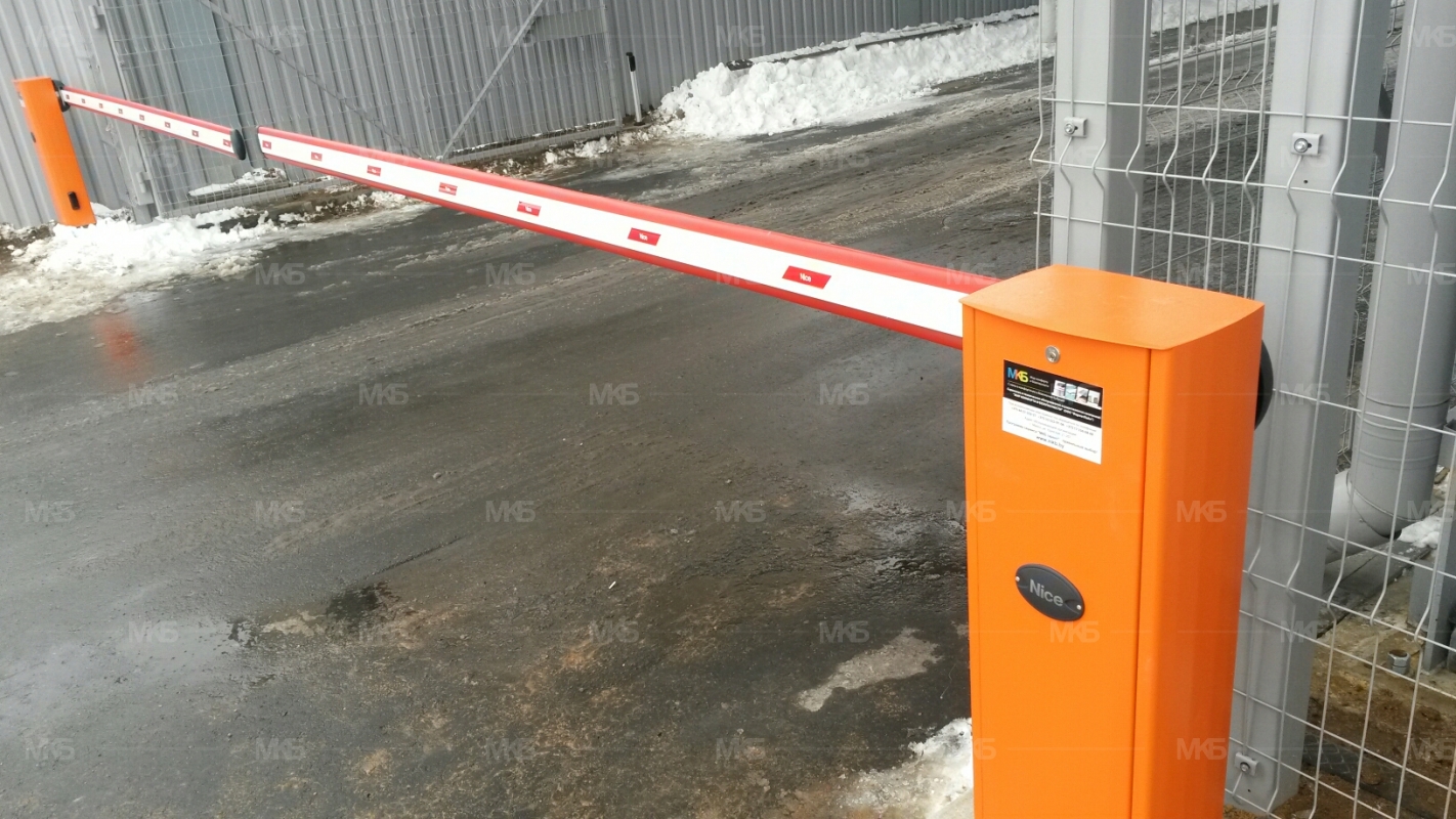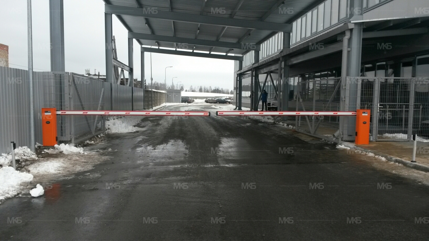 Организация пропускного режима. Установка 2-х шлагбаумов NICE WIL4, управление стационарное и радио. Датчики безопасности (фотоэлементы) вынесены на расстояние 2-х метров на въезд и выезд, и также располагаются под стрелой шлагбаума.