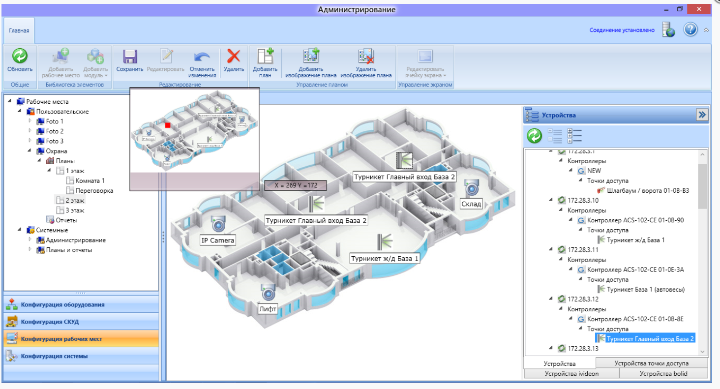 - Размещение на планах как элементов СКУД, так и видео камер и интегрированных устройств ОПС Болид;